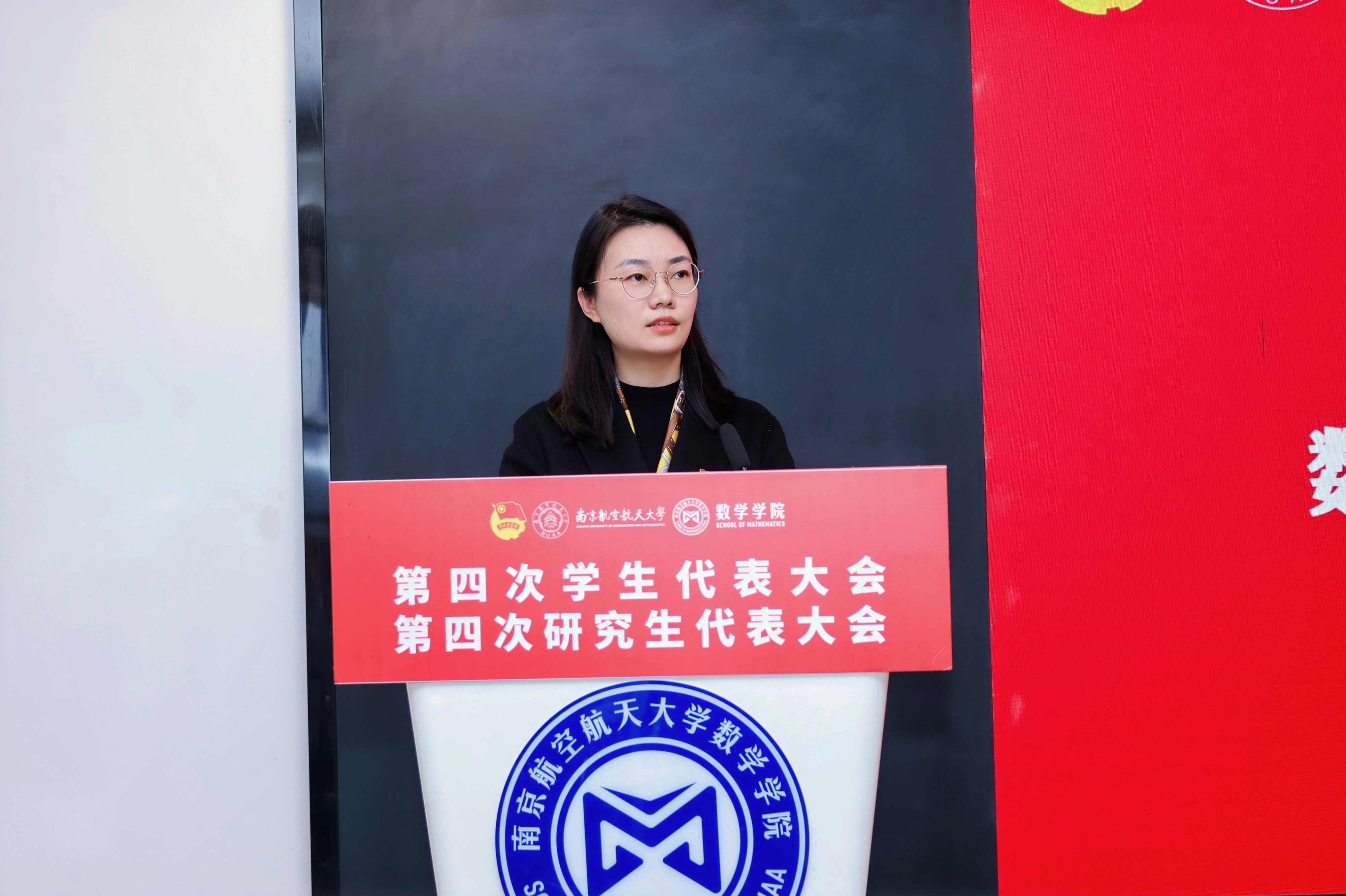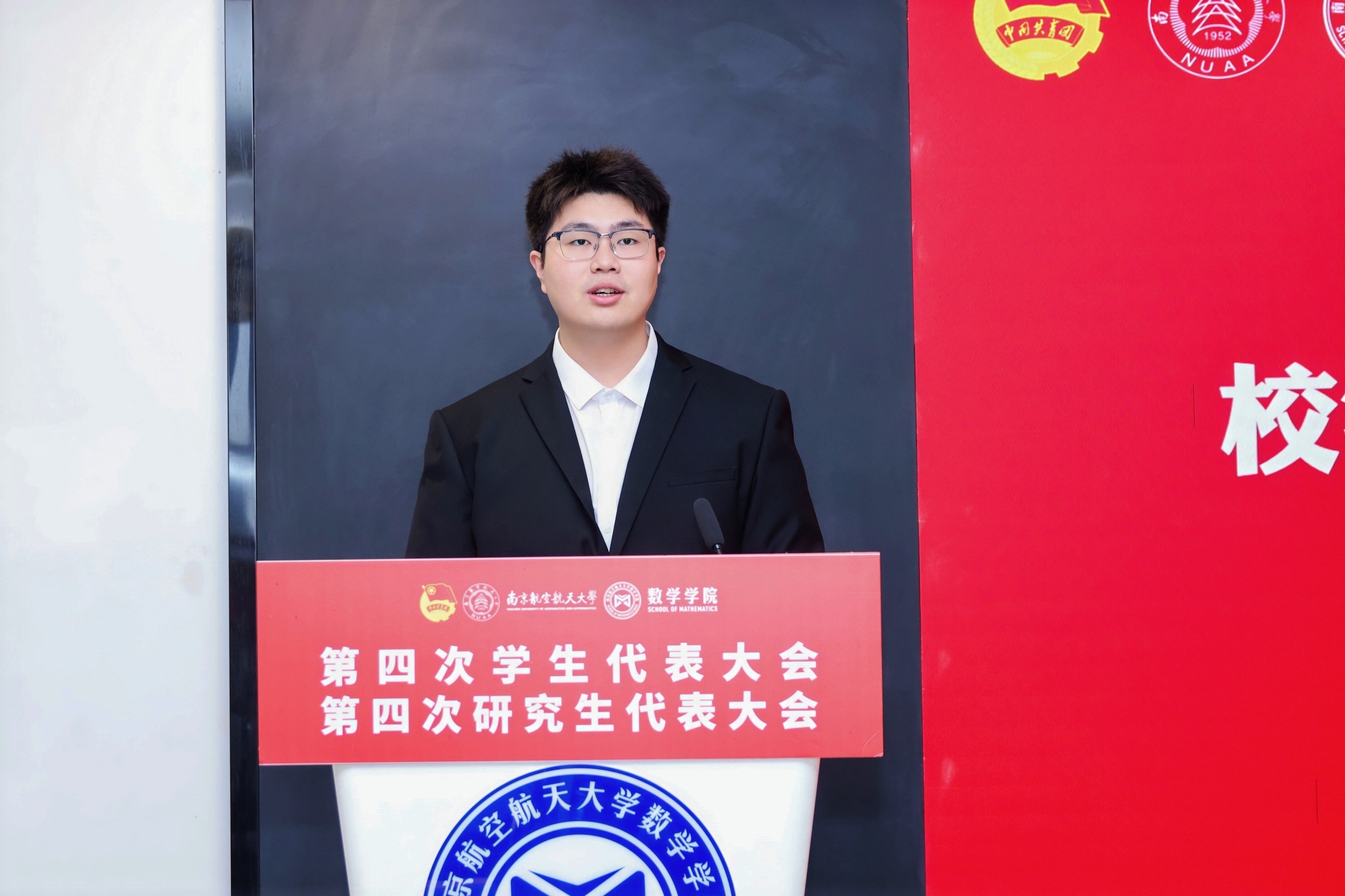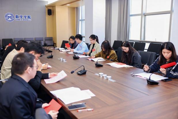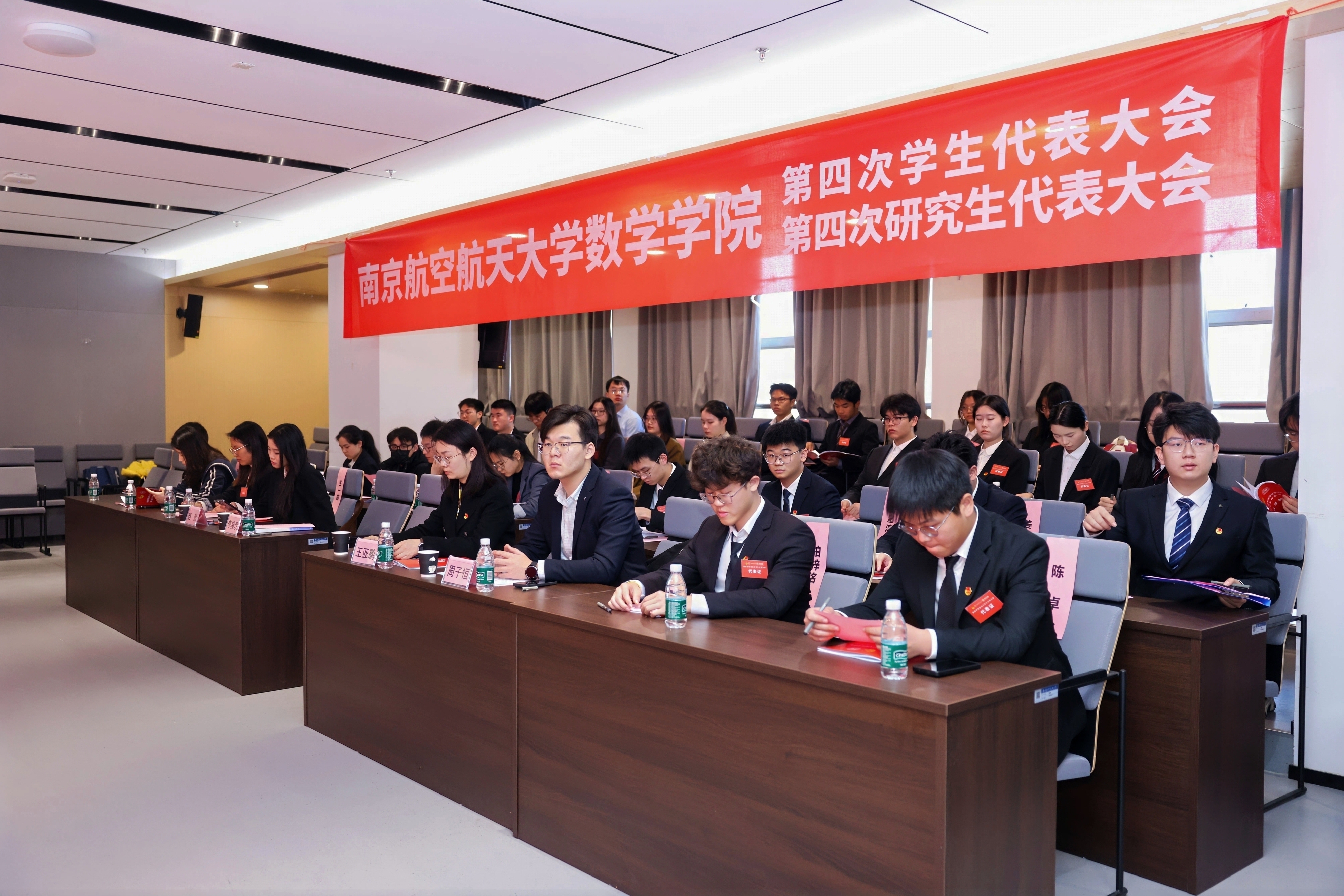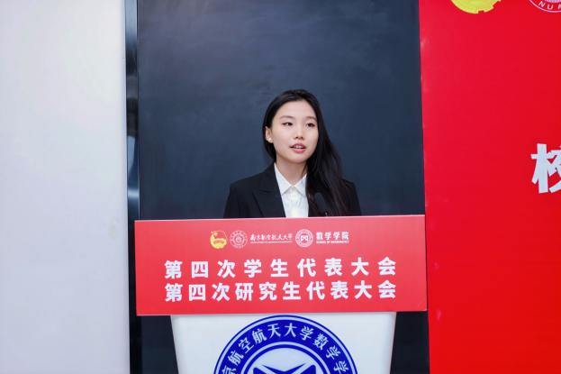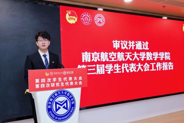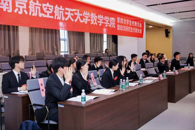 11 月 30 日,数学学院第四次学生代表大会、第四次研究生代表大会在将军路校区一号楼20楼报告厅顺利召开。学院党委副书记王亚鹏,团委书记、研究生辅导员康怡宁,本科生辅导员周子恒,校学生会主席团成员李威汉,校研究生会主席团成员赵然出席大会开幕式,学院本科生代表和研究生代表共同参加大会,履行学生代表职责,共商学院学生工作发展大计。