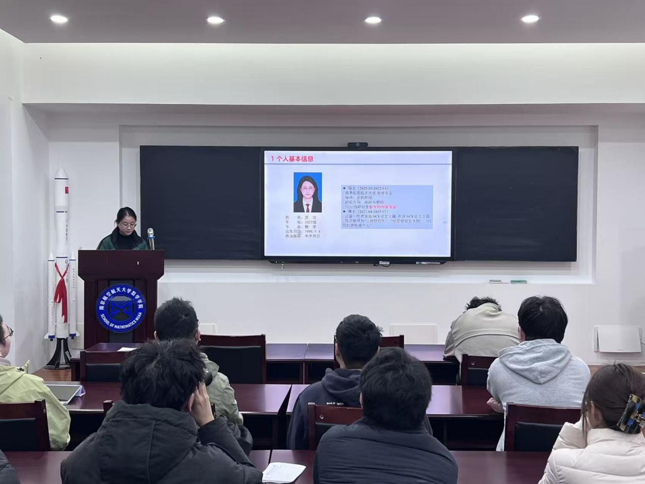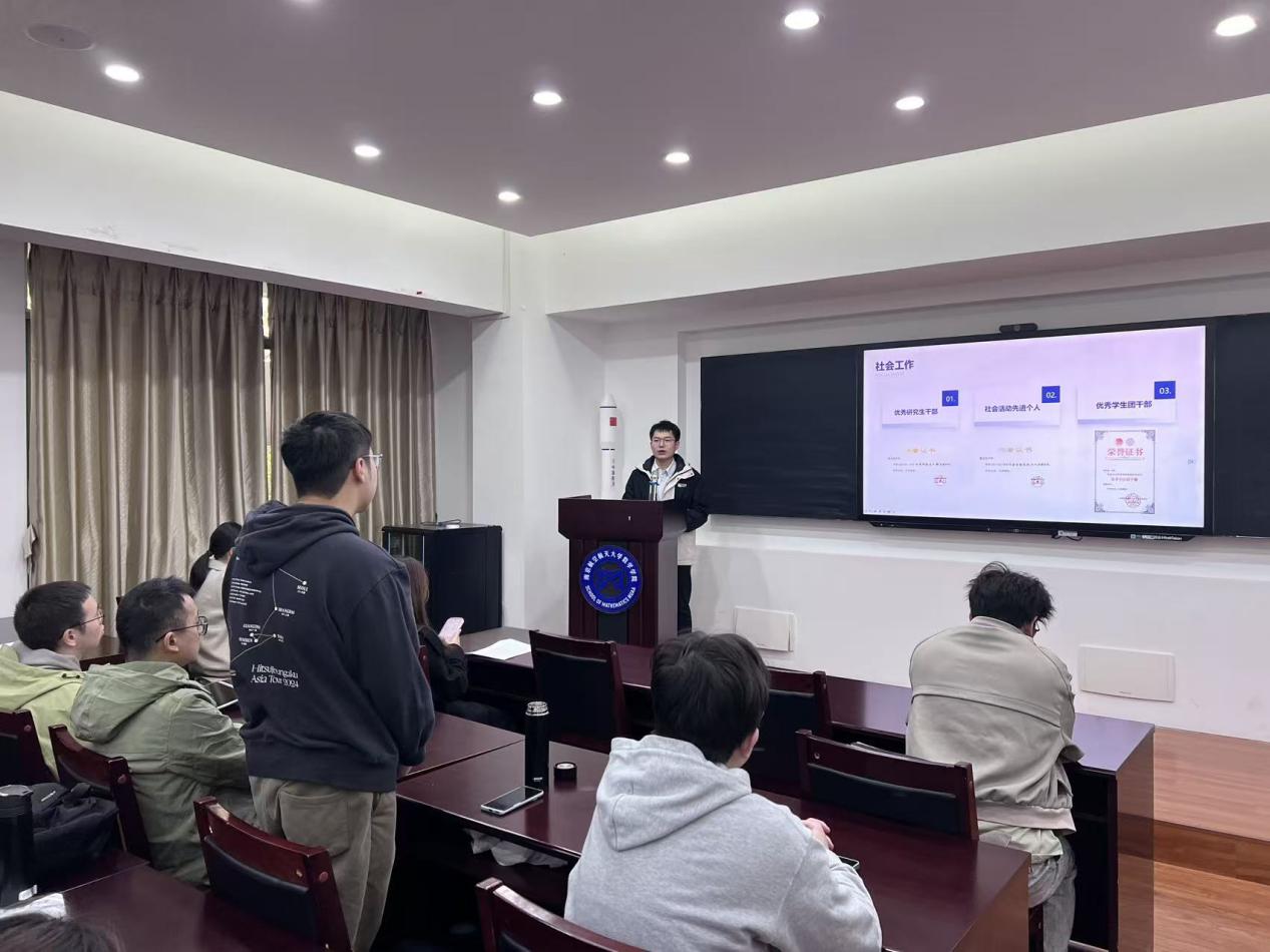 为充分发挥学生榜样示范作用,帮助研究生明晰学业规划、科研路径与成长方向,12月10日下午,数学学院举办优秀研究生国家奖学金经验分享会。博士研究生贾雪及硕士研究生陈思月、姜景、郭沛芫结合自身学术经历与实践感悟,从不同研究方向、不同成长维度出发,为在场同学带来了一场干货十足的分享盛宴,活动现场互动热烈,氛围浓厚。